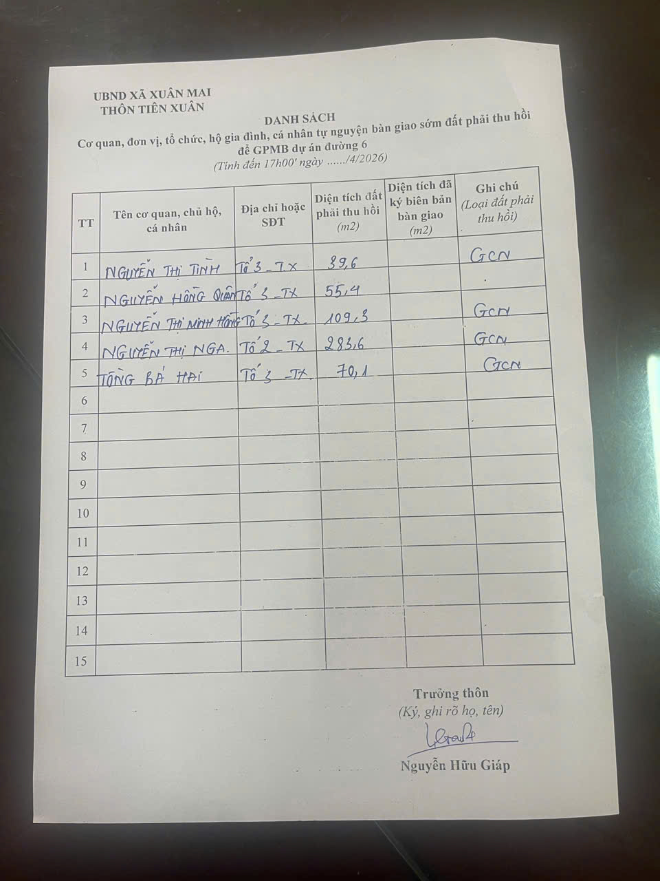 Theo thống kê đến 17 giờ ngày 28 tháng 4 năm 2026, trên địa bàn thôn Tân Mai có 16 hộ gia đình, cá nhân; thôn Tân Bình có 9 hộ; thôn Tiên Xuân và thôn Xuân Hà có 5 hộ gia đình, cá nhân đã tự nguyện bàn giao sớm diện tích phải thu hồi để giải phóng mặt bằng dự án cải tạo nâng cấp đường quốc lộ 6; Cùng đó, 41 hộ gia đình trên địa bàn thôn Tiên Trường, 18 hộ gia đình thôn Tiến Ân đã bàn giao mặt bằng, đã và đang tháo dỡ các công trình trên đất.